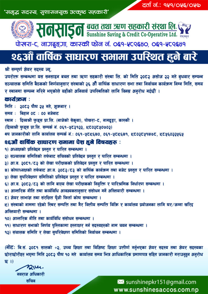 सनसाइन बचत तथा ऋण सहकारी संस्था लि., पोखरा–८, कास्कीको २४औं वार्षिक साधारण सभा संस्थाका अध्यक्ष श्री अग्निप्रसाद कँडेलको अध्यक्षतामा २०८० आश्विन १० गते बुधबारका दिन दिव्यश्रि फुड्स प्रा.लि.(बाजेको सेकुवा), पोखरा–८, नागढुङ्गामा सम्पन्न भएको छ । गण्डकी प्रदेश, सामाजीक विकास तथा स्वास्थ्य मन्त्रालयका माननीय मन्त्री सुशिला सिंखडाज्यूको प्रमुख आतिथ्यतामा उद्घाटन गरिएको उक्त कार्यक्रममा विशेष अतिथि संविधानसभा